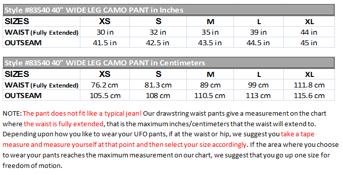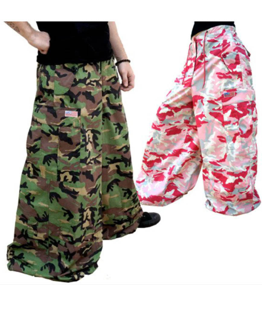 UFO presents a classic UFO Wide Leg style, but now in eye-catching camo print! Our popular UFO wind fabric has been updated with camo print that comes in many different color combinations. The baggy cut is unisex and allows easy movement for hours, making it the perfect fit for any dance enthusiasts as well as the perfect addition to any rave wear or Y2K inspired wardrobe. This pant features two top button flap pockets, two extra large side cargo pockets with eye-catching pleat detail and UFO’s signature twill tapes in matching color, and a single button back pocket, giving you plenty of storage. The bottom of the wide leg features loop and gusset details on the front and back of both legs, perfect for storing glow sticks while dancing. Drawstrings at the waist and bottom of the pants give a comfortable fit. Made of 65% Cotton, 35% Poly, this pant is machine washable.